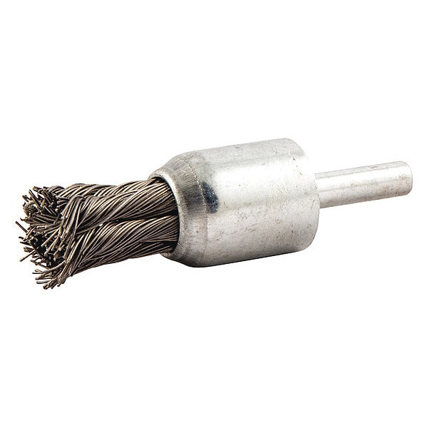 End Brush, Product Type End Brush, Quick Change System Not Applicable, Bristle Type Standard Twist Knot Wire, Bristle Material Carbon Steel, Brush Dia. 3/4 in, Wire Dia. 0.014 in, Bristle Length 7/8 in, Grit Not Applicable, Overall Length 2 1/4 in, Compatible Tool Type Straight Grinder, Drill Press, Impact Driver, Pencil Grinder, Color Not Applicable, Primary Material Application Carbon Steel, Cast Iron, Wood, Connector Type Round Shank, Connector Size 1/4 in