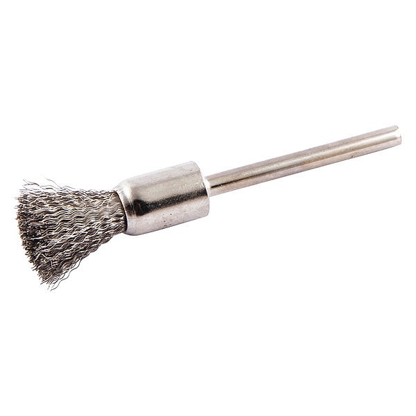End Brush, Product Type End Brush, Quick Change System Not Applicable, Bristle Type Crimped Wire, Bristle Material Stainless Steel, Brush Dia. 5/16 in, Wire Dia. 0.005 in, Bristle Length 9/16 in, Grit Not Applicable, Overall Length 2 1/4 in, Compatible Tool Type Straight Grinder, Drill Press, Impact Driver, Pencil Grinder, Color Not Applicable, Primary Material Application Aluminum, Brass, Copper, Stainless Steel, Wood, Connector Type Round Shank, Connector Size 1/8 in
