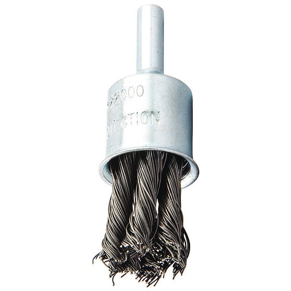 End Brush, Product Type End Brush, Quick Change System Not Applicable, Bristle Type Standard Twist Knot Wire, Bristle Material Carbon Steel, Brush Dia. 3/4 in, Wire Dia. 0.02 in, Bristle Length 7/8 in, Grit Not Applicable, Overall Length 2 1/4 in, Compatible Tool Type Straight Grinder, Drill Press, Impact Driver, Pencil Grinder, Color Not Applicable, Primary Material Application Carbon Steel, Cast Iron, Wood, Connector Type Round Shank, Connector Size 1/4 in, Operating Speed - Maximum 22,000 RPM
