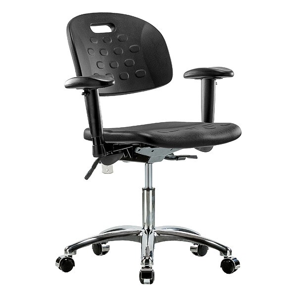 Cleanroom Chair, Weight Capacity 300 lb, Material Vinyl (Antibacterial), Seat Height Range 17-3/4 in to 23 in, Color Black, Seat Width 18 in, Seat Depth 17 in, Seat Tilt Backward Not Applicable, Seat Tilt Forward Not Applicable, Back Height 12 in, Back Width 16 1/2 in, Back Tilt Backward 13.5 Degrees , Back Tilt Forward 10.5 Degrees , Number of Casters 5, Number of Glides 0, Foot Support No, Standards ANSI/BIFMA, CAL 117, ISO 5
