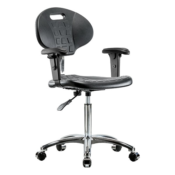 Cleanroom Task Chair, Weight Capacity 300 lb, Material Vinyl (Antibacterial), Seat Height Range 19-1/2 in to 27 in, Color Black, Seat Width 18 in, Seat Depth 17 in, Seat Tilt Backward Not Applicable, Seat Tilt Forward Not Applicable, Back Height 12 in, Back Width 16 1/2 in, Back Tilt Backward Not Applicable, Back Tilt Forward Not Applicable, Number of Casters 5, Number of Glides 0, Foot Support No, Standards ANSI/BIFMA, CAL 117, ISO 4