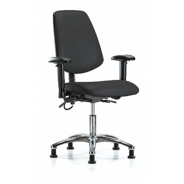 ESD Chair, Weight Capacity 300 lb, Material Vinyl (Antibacterial), Seat Height Range 19 in to 24 in, Color Black, Seat Width 18 1/2 in, Seat Depth 17 in, Seat Tilt Backward 3 Degrees , Seat Tilt Forward 8 Degrees , Back Height 18 in, Back Width 16 1/2 in, Back Tilt Backward 13.5 Degrees , Back Tilt Forward 10.5 Degrees , Number of Casters 0, Number of Glides 5, Foot Support No, Standards ANSI/BIFMA, CAL 117, Not Applicable
