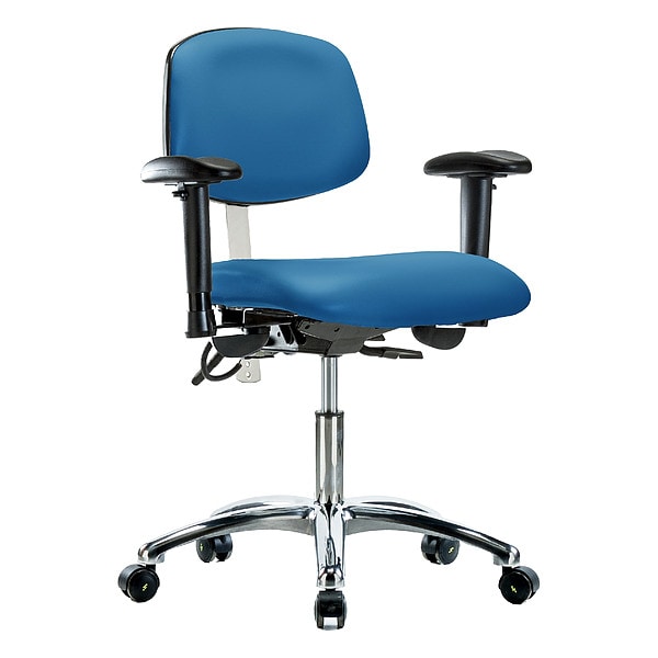ESD/Cleanroom Chair, Weight Capacity 300 lb, Material Vinyl (Antibacterial), Seat Height Range 19 in to 24 in, Color Blue, Seat Width 19 in, Seat Depth 18 in, Seat Tilt Backward Not Applicable, Seat Tilt Forward Not Applicable, Back Height 11 1/2 in, Back Width 16 1/2 in, Back Tilt Backward 13.5 Degrees , Back Tilt Forward 10.5 Degrees , Number of Casters 5, Number of Glides 0, Foot Support No, Standards ANSI/BIFMA, CAL 117, ISO 5