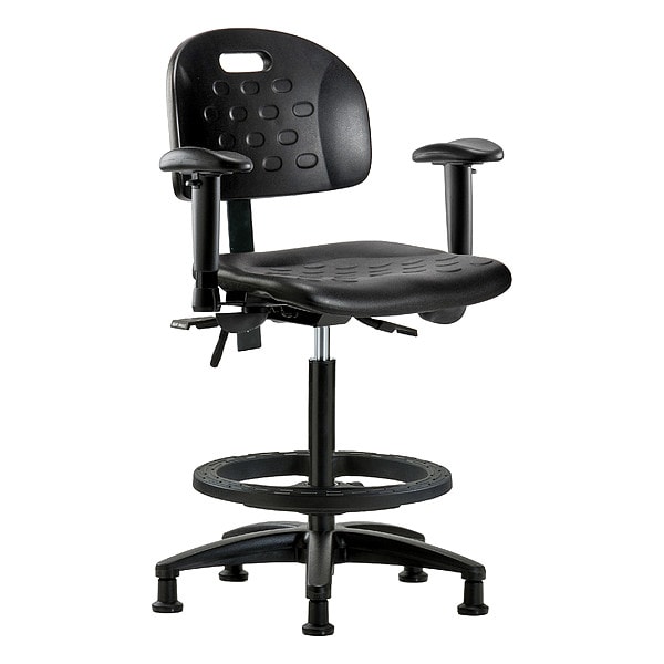 Ergonomic Chair, Weight Capacity 300 lb, Material Polyurethane, Seat Height Range 24-1/4 in to 34 in, Color Black, Seat Width 18 in, Seat Depth 17 in, Seat Tilt Backward Not Applicable, Seat Tilt Forward Not Applicable, Back Height 12 in, Back Width 16 1/2 in, Back Tilt Backward 13.5 Degrees , Back Tilt Forward 10.5 Degrees , Number of Casters 0, Number of Glides 5, Foot Support Yes, Standards ANSI/BIFMA, CAL 117, Not Applicable