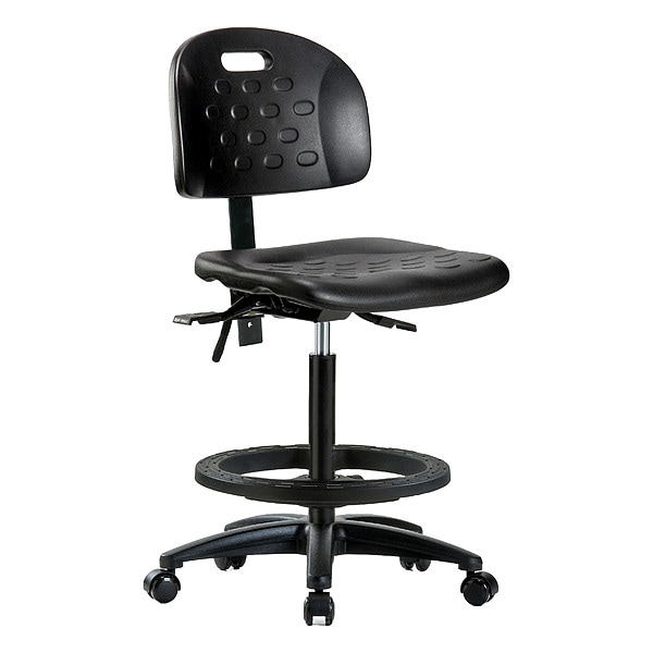 Ergonomic Chair, Weight Capacity 300 lb, Material Polyurethane, Seat Height Range 24-1/4 in to 34 in, Color Black, Seat Width 18 in, Seat Depth 17 in, Seat Tilt Backward Not Applicable, Seat Tilt Forward Not Applicable, Back Height 12 in, Back Width 16 1/2 in, Back Tilt Backward 13.5 Degrees , Back Tilt Forward 10.5 Degrees , Number of Casters 5, Number of Glides 0, Foot Support Yes, Standards ANSI/BIFMA, CAL 117, Not Applicable