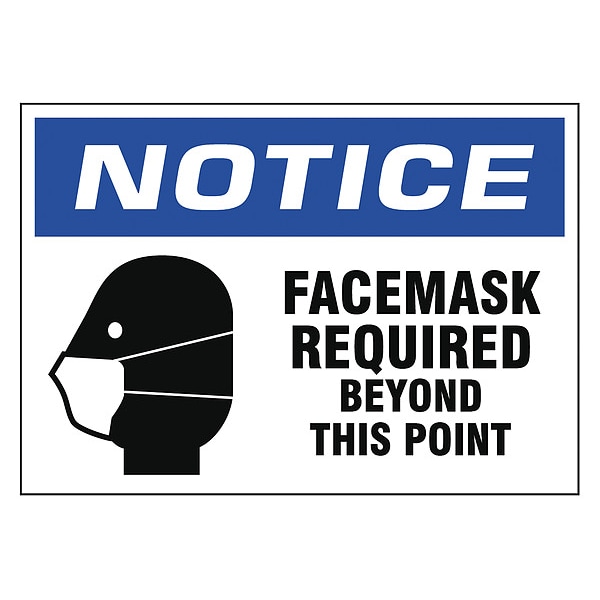 Adhesive Safety Sign, Sign Subject Matter Coronavirus Prevention, Height 7 in, Width 10 in, Sign Material Vinyl, Sign Mounting Style Adhesive Surface, Header Notice, Legend Facemask Required Beyond This Point, Printed Language English