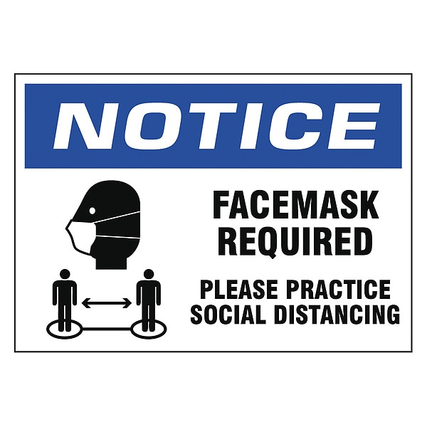 Adhesive Safety Sign, Sign Subject Matter Social Distancing, Height 7 in, Width 10 in, Sign Material Vinyl, Sign Mounting Style Adhesive Surface, Header Notice, Legend Facemask Required Please Practice Social Distancing, Printed Language English