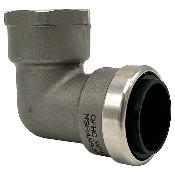 Push-Fit Elbow Fitting, Application Potable Water, Fitting Side A Connection Type Push-to-Connect, Fitting Side B Connection Type FNPT, Fitting Side A Pipe Size Not Applicable, Fitting Side B Pipe Size 3/4 in, Fitting Side A Tube Outer Diameter 3/4 in, Fitting Side B Tube Outer Diameter Not Applicable, Fitting Material Stainless Steel, Fitting Thread Size 3/4 In., Material Grade 304, Color Silver, Includes Pre-Applied Thread Sealant Pre-Applied Thread Sealant Not Included