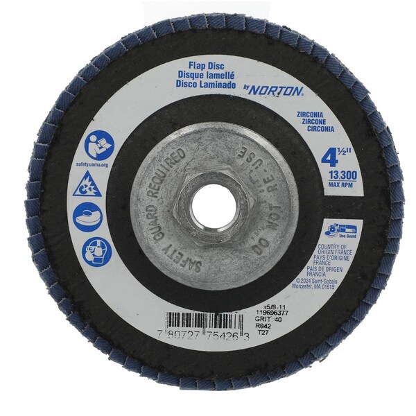 Flap Disc, Abrasive Type Coated, Abrasive Material Zirconia Alumina, Grade Coarse, Backing Plate Material Fiberglass, Connector Size 5/8 In.-11, Connector Type Threaded Hole, Density Rating Standard, Flap Disc Type Type 27, Overall Diameter 4 1/2 in, Series XC1176, Backing Material Fiberglass, Backing Weight Y, Grit 40, Maximum Operating Speed 13,300 RPM