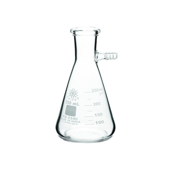Borosilicate glass filtering flask with 250ml capacity. Heavy-walled flask features a heavy-duty rim and bolt neck ideal for vacuum filtration. Graduations are printed in durable white enamel. United Scientific flasks deliver an unbeatable combination of thermal shock resistance and physical strength. A vacuum can be applied in 5-minute intervals. When restarting the vacuum, make sure to release the current vacuum to ensure proper pressure management. The pressure of the air that is removed should never exceed 600 mm Hg at any point in time.