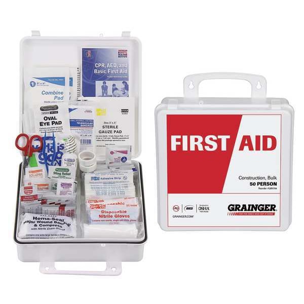 First Aid Kit and Housing, Product Type First Aid Kit and Housing, Application Industrial, Number of People Served 50, Number of Components 103, Number of Pockets 0, Adhesive Bandages Included Bandage, Documentation Included First Aid Guide, Wound Dressings Included Cold Pack, Triangular Bandage, (10) Gauze Pads, (2) Combine Dressings, (2) Tapes, (3) Gauze Rolls, (4) Eye Pads, Miscellaneous Kit Contents Included Not Applicable