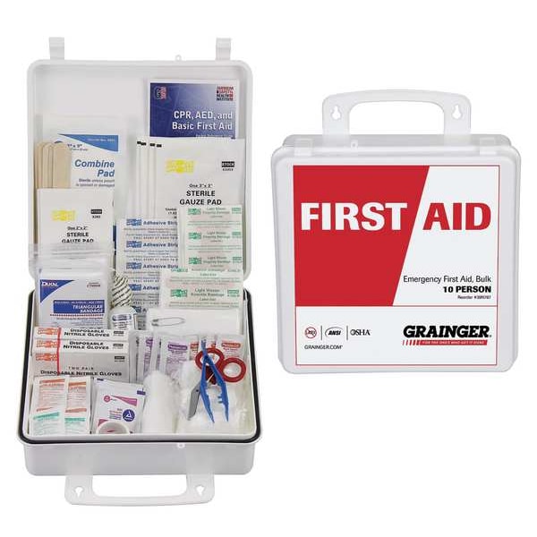 First Aid Kit and Housing, Product Type First Aid Kit and Housing, Application Industrial, Number of People Served 10, Number of Components 133, Number of Pockets 0, Adhesive Bandages Included (10) Fingertip Bandages, (10) Knuckle Bandages, (20) Bandages, Documentation Included First Aid Guide, Wound Dressings Included Combine Dressing, (2) Tapes, (3) Triangular Bandages, (6) Gauze Rolls, (8) Gauze Pads, Miscellaneous Kit Contents Included Not Applicable