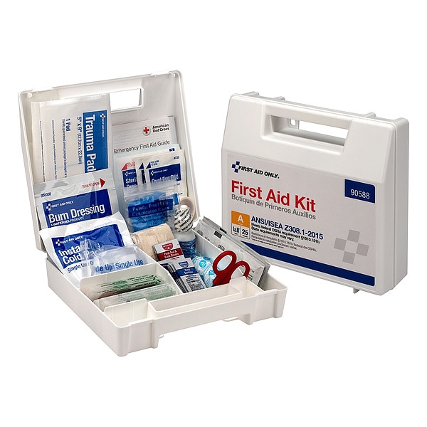 First Aid Kit and Housing, Product Type First Aid Kit and Housing, Application Industrial, Number of People Served 25, Number of Components 87, Number of Pockets 0, Adhesive Bandages Included (32) Bandages, Documentation Included First Aid Guide, Wound Dressings Included Burn Dressing, Cold Pack, Gauze Roll, Tape, Triangular Bandage, (2) Eye Pads, (2) Trauma Pads, (4) Gauze Pads, Miscellaneous Kit Contents Included Not Applicable