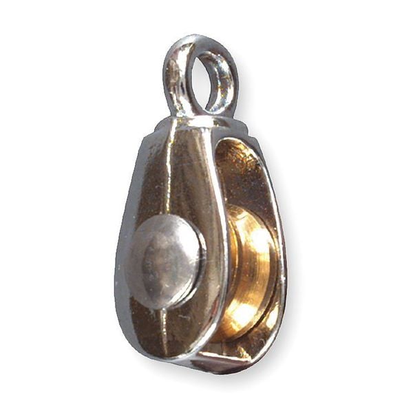 Pulley, Fixed Eye, Nickel, Chrome, Height 1 1/8 In, Width 1/2 In, Size 1/2 In, Rope Dia 3/16 In, Wheel Dia 1/2 In, Eye Width 3/16 In, Max Load Capacity 15 Lb