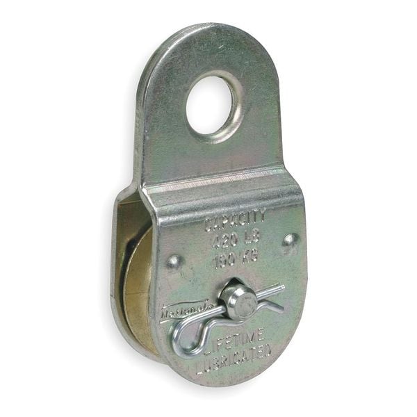 Pulley, Fixed Eye, Nickel, Zinc, Height 3 21/32 In, Width 2 1/8 In, Size 2 In, Rope Dia 3/8 In, Wheel Dia 2 In, Eye Width 1/2 In, Max Load Capacity 480 Lb