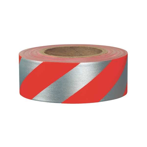 Flagging Tape, Color Red/Silver, Pattern Diagonal Stripe, Legend No Legend, Legend Color Not Applicable, Tape Thickness 2 mil, Tape Length 300 ft, Tape Width 1 3/16 in, Reflectivity Reflective, Material Vinyl, Product Type Flagging Tape, Resistance Properties UV Resistant, Maximum Temperature -20 Degrees F, Standards OSHA 1910.144(a), OSHA 1926-956(c)(1)