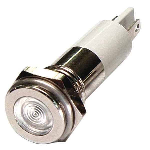 Flush Panel Light, LED, Brass Plated Chrome, LED, Plastic (ABS), White, Voltage 24V DC, Size 10mm Mounting dia, Electrical Connection 0.11 Male Quick Disconnect, Shape Round, Current Drawn 20 mA, Average Life 100,000 hr, IP Rating IP40, Panel Thickness Up to 0.160 in, Standards cRUus, RoHS