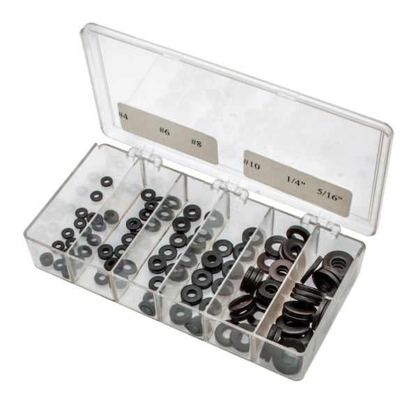 Assort,#4 to 5/16 F/W Steel Hard Blk OX, Dimensional Standards RoHS Compliant (With Exemption for Lead), Finish Black Oxide, Largest Outside Diameter 5/16 in, Largest Screw Size 5/16 in, Material Steel, Material Grade/Class Case Hardened, Maximum Thickness 5/64 in, Minimum Thickness 1/8 in, Number of Sizes Included 6, Number of Washers Included 120, Screw Sizes 5/16 to 3/4 in, Smallest Outside Diameter 3/4 in, Smallest Screw Size #4, System of Measurement Inch