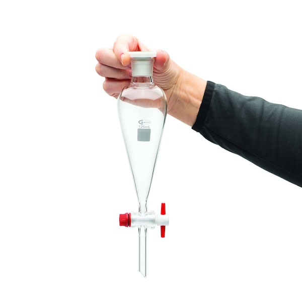 Pack of two pear-shaped borosilicate glass funnels with 125ml capacity. Funnels feature a durable marking spot and large white block letters for easy identification of capacity, as per ASTM E1096. Included PTFE stopcocks are compliant with ASTM standard E675. Size 22 plastic stoppers also included.