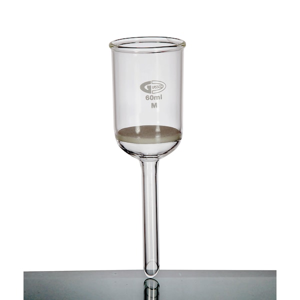 Pack of 2 Buchner funnels with 60ml capacity. Crafted from thick-walled borosilicate glass, each funnel includes a 40mm fritted disc with fine porosity. Funnel rims are beaded. Porosity of Course(C) is 40- 60 Microns, Porosity of Fine (F) is 5-15 Microns, Porosity of Medium (M) is 15-40 Microns.