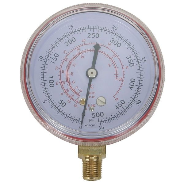 High Side Gauge, Diameter 2 1/2 in, Working Pressure 500 psi, Connection Size 1/8 in, Color Red, Gauge Type High Side Gauge, Gauge Accuracy +/-3-2-3 Percent, For Use With R12/R22/R502 Refrigerants, Application Replacement Manifold Gauge for Manifold Gauge Sets