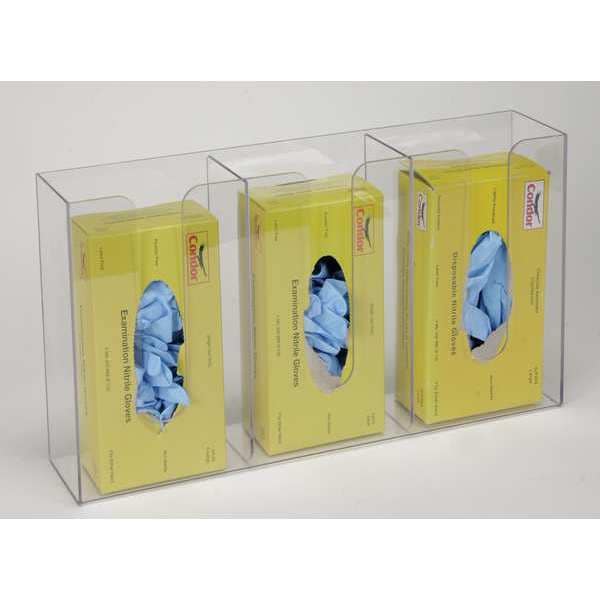 Glove Dispenser, Box Opening Orientation Front, Box Orientation Vertical, Dimensions 11-1/8 in H x 19-7/8 in W x 4 in D, Dispenser Features Dividers, Dispenser Layout (3) Boxes, FDA Compliant Not FDA Compliant, Fill Direction Top Load, Glove Dispenser Type Controlled Environment, Food Service, General Purpose, Dispenser Contains Standard Glove Box, Color Clear, Depth 4 1/4 in, Height 11 1/8 in, Material PETG, Width 19 3/4 in, Holder Mount Location Countertop, Wall