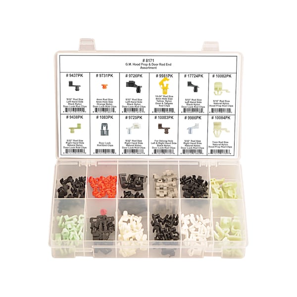 GM Hood Prop and Rod End Assortment, Compatible with Vehicle Make Ford, Fastener Material Metal, Nylon, Assortment Type Hood Clip, Nylon Door Lock Rod Clip, Nylon Hood Prop Clip, Includes (12) Black Nylon Door Lock Rod Clips 5/32 in Rod Size Left Hand Side GM # 20582532, (12) Black Nylon Door Rod & Hood Clips 5/32 in Rod Size Left Hand Side FORD # N804344S, (20) Orange Nylon Door Lock Rod Clips 4 mm Rod Size 6 mm Hole Size GM # 16606936, (6)