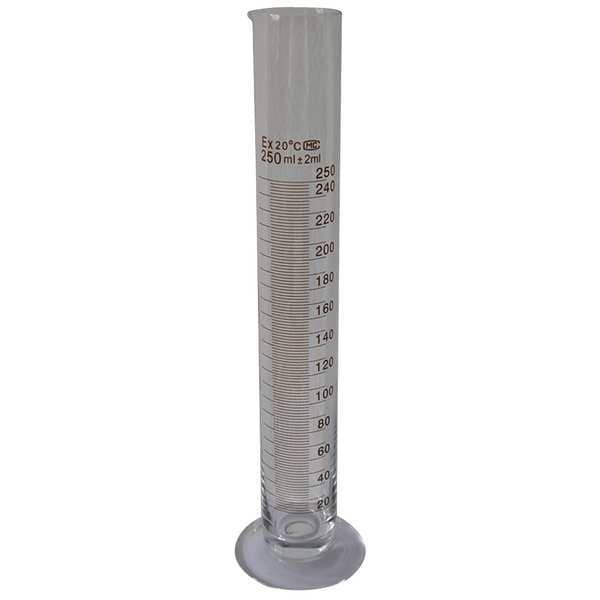 Graduated Cylinder, Capacity - Metric 250 mL, Capacity - English 8.5 fl oz, Graduation Increments - Metric 2 mL, Graduation Increments - English Not Applicable, Maximum Graduation - Metric 250 mL, Minimum Graduation - Metric 10 mL, Body Diameter - Metric 42 mm, Autoclavable Yes, Body Color Clear, Clarity Transparent, USP Specification Not Applicable, Glassware Class Not Applicable, Sterile/Non-Sterile Non-Sterile, Volumetric Calibration To Deliver (TD), ASTM Specification Not Applicable