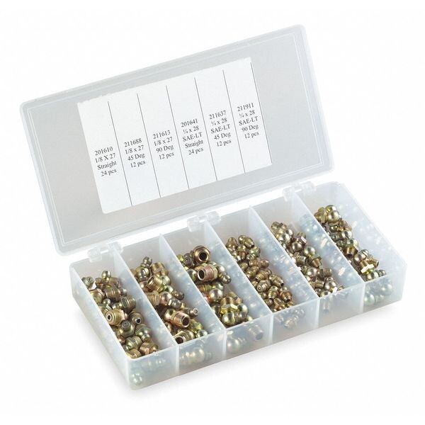 Grease Fitting Kit, Grease Fitting Style Standard, Fitting Material Steel, Dimension Type SAE, Thread Size 1/4 In.-28, 1/8 In.-27, Number of Pieces 96