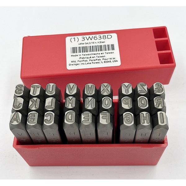 Hand Stamp Kit, Character Height 3/16 in, Character Type Set Letter Set, Characters Included A to Z, Ampersand (&), Duty Heavy, For Maximum Surface Hardness 62 HRC, For Shank Diameter 3/8 in, Holder Length Not Applicable, Holder Shank Size Not Applicable, Holder Width Not Applicable, Impression Character Style Gothic, Includes Holder No, Letter Casing Uppercase, Maximum Characters per Line Not Applicable, Product Type Hand Stamp Kit, Replacement Holder Mfr. Model Number Not Applicable