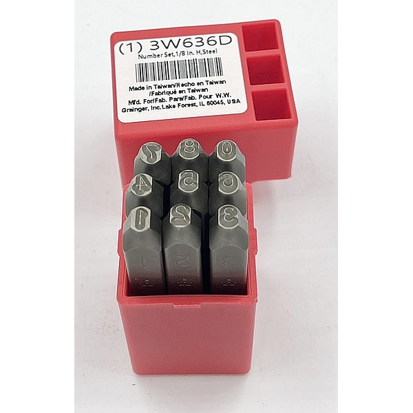 Hand Stamp Kit, Character Height 1/8 in, Character Type Set Number Set, Characters Included 0 to 8 (With 6 Serving as 9), Duty Heavy, For Maximum Surface Hardness 62 HRC, For Shank Diameter 5/16 in, Holder Length Not Applicable, Holder Shank Size Not Applicable, Holder Width Not Applicable, Impression Character Style Gothic, Includes Holder No, Letter Casing Uppercase, Maximum Characters per Line Not Applicable, Product Type Hand Stamp Kit, Replacement Holder Mfr. Model Number Not Applicable