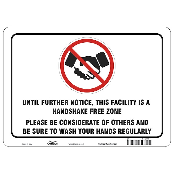 Covid 19 Sign 10X14, Handshake Free Cv19, Sign Subject Matter Coronavirus Prevention, Height 10 in, Width 14 in, Sign Material Polystyrene, Sign Mounting Style With Mounting Holes, Header No Header, Legend Hasta Nuevo Aviso Esta Instalaci�n Es Una Zona Libre De Saludo De Manos; Por Favor, Considere A Los Demas Y Aseg�rese De Lavarse Las Manos Regularmente, Printed Language English