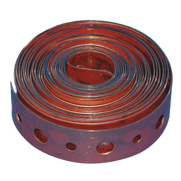 Hanging Strap, Finish Copper-Plated, Hanger Material Steel, Hole Spacing 1/2 in, Metal Material Gauge 24 ga, Mounting Hole Diameter 5/32 in, 1/4 in, Overall Length 100 ft, Overall Width 3/4 in, For Use On Pipe, Mount Type Bolt, Nail, Band Type Perforated/Holes