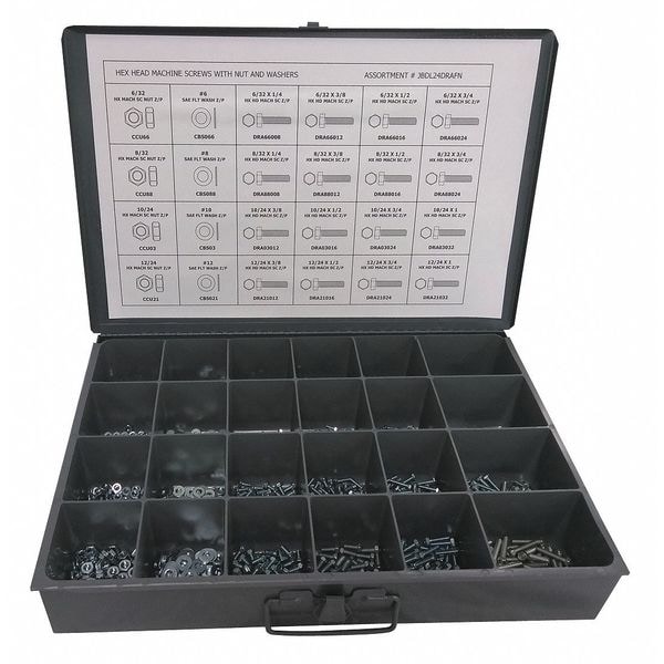 Hex Head Cap Screw Assortment, Metal Box, Container Material Metal, Steel, Zinc-Plated, Flat Washers Included #10, #12, #6, #8, Hex Nuts Included Hex Nuts: (100) 6-32, (100) 8-32, (100) 10-24, (100) 12-24, Lock Washers Included Lock Washers Not Included, Screws/Bolts Included Hex Head Cap Screws: (50) 6-32x1/4 in, (50) 6-32x3/8 in, (50) 6-32x1/2 in, (50) 6-32x3/4 in, (50) 8-32x1/4 in, (50) 10-24x3/8 in, (50) 10-24x1 in, (50) 12-24x3/8 in, Hex, Number of Sizes 24, Drive Unslotted, Hex