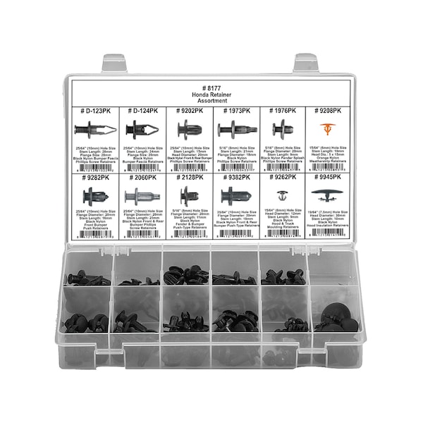 Honda Retaier Assortment, Number of Pieces 121, Number of Sizes 12, Product Type Push-In Rivet Assortment, Material Grade/Class Ungraded, Manufacturer Location Globally Sourced, Made in North America No