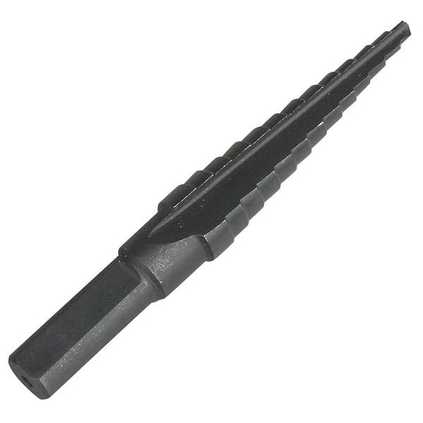 Step Drill Bit, High Speed Steel, Black Oxide, 1/8 in to 1/2 in Size Range, Straight with Three Flats, 1/4 in Shank Diameter, 2 7/8 in Overall Length, Maximum Drilling Depth 3.4 mm