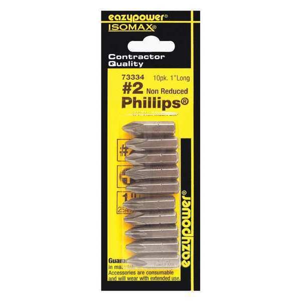 Power Bit, Application - Tools Impact, Bit Style Phillips, Fastening Tool Tip Size #2, Shank Style Hex, Hex Shank Size 1/4 in, Single End, Fastening Tool Material S2 Steel, Overall Bit Length 1 in, SAE, Finish Unfinished, Impact Rated Impact Rated, Power Bit, Package Quantity 10