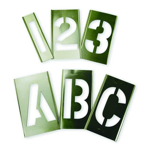 Stencil Set, Character Type Letter/Number Set, Duty Moderate, FAA AC 150/5340-1K Compliant Not Applicable, Font Not Applicable, Included Characters, Messages, and Symbols 0 to 9, A to Z, Ampersand (&), Apostrophe ('), Comma (,), Dash (-), Period (.), Includes (2) B, C, D, F, G, H, J, K, L, M, P, R, T, U, V, W, X, Y, Z, 2 to 9, Period(.), Ampersand (&), (3) A, I, N, O, S, 1, 0, Spacer, (4) E, Beginner, Ender, Period Ender (·), Individual Character Height 3 in, Individual Character Width 1 1/2 in