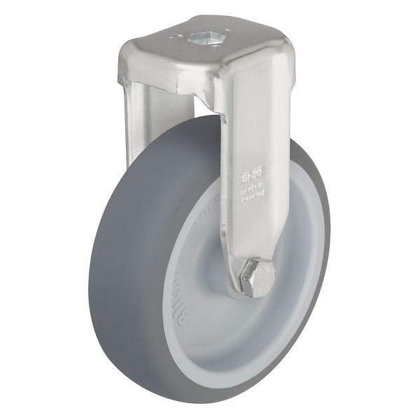 Bolt-Hole Caster, 1/2 in Bolt Hole Dia., Stainless Steel Frame Finish, Light Load Rating Range, 242 lb Load Rating, 1 Number of Wheels, 5 1/5 in Mounting Height, 4 in Wheel Dia., 1 1/4 in Wheel Width, Rubber Wheel/Tread Material