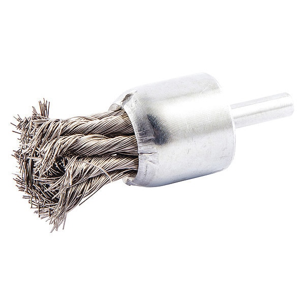 End Brush, Product Type End Brush, Quick Change System Not Applicable, Bristle Type Standard Twist Knot Wire, Bristle Material Stainless Steel, Brush Dia. 1 in, Wire Dia. 0.01 in, Bristle Length 1 1/8 in, Grit Not Applicable, Overall Length 2 3/4 in, Compatible Tool Type Straight Grinder, Drill Press, Impact Driver, Pencil Grinder, Color Not Applicable, Primary Material Application Aluminum, Brass, Copper, Stainless Steel, Wood, Connector Type Round Shank, Connector Size 1/4 in