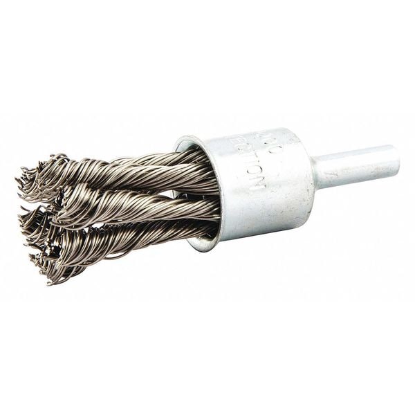 End Brush, Product Type End Brush, Quick Change System Not Applicable, Bristle Type Standard Twist Knot Wire, Bristle Material Stainless Steel, Brush Dia. 3/4 in, Wire Dia. 0.02 in, Bristle Length 1 in, Grit Not Applicable, Overall Length 2 7/8 in, Compatible Tool Type Straight Grinder, Drill Press, Impact Driver, Pencil Grinder, Color Not Applicable, Primary Material Application Aluminum, Brass, Copper, Stainless Steel, Wood, Connector Type Round Shank, Connector Size 1/4 in