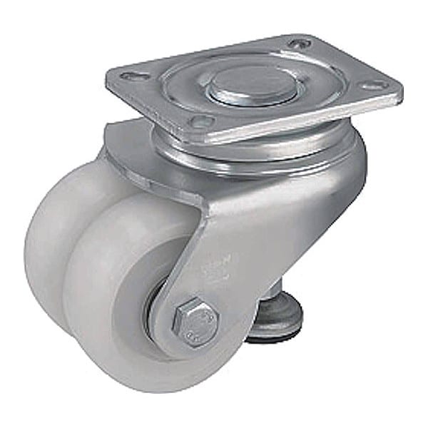 Swivel, Plate Caster, Load Rating 1320 lb, Wheel Dia. 3 in, Wheel Width 1 1/4 in, Wheel/Tread Material Nylon, Wheel Core Material Nylon, Non-Marking Yes, Number of Wheels 2, Caster Brake Type Leveling Pad, Tread Shape Standard