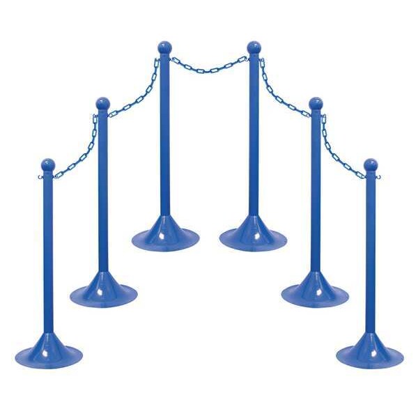 Light Duty Stanchion Kit, Number of Posts 4, Post Height 41 in, Number of Chains 1, Chain Length 50 ft, Link Outside Length 1.9 in, Link Outside Width 1.1 in, Base Type Dome, Chain Color Blue, Post Color Blue, Reflectivity Non-Reflective, Includes (6) Light Duty Stanchions, 50 ft of 2 in Plastic Chain, Post Diameter 2 in, Fillable Yes, Base Diameter 14 in, Base Weight 16 lb, Post Finish Matte, Base Color Blue, Post Material Plastic, Chain Material Plastic, Base Material HDPE