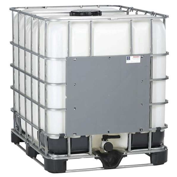 IBC Tote, Drain Connection Gender Male, Drain Connection Type Cam-and-Groove, Drain Opening Diameter 2 in, Fill Opening Diameter 6 in, Frame Material Steel Wire, Graduation Mark Increments Not Applicable, Liquid Storage Capacity 275 gal, Overall Depth 47 1/4 in, Overall Diameter 47 1/4 in, Overall Height 45 1/2 in, Overall Width 39 1/4 in, Standards FDA Approved, Tank Material Polyethylene, Tank Material Thickness Not Applicable, Tank Opening Type Closed Top