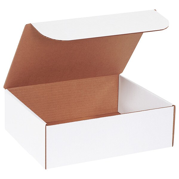 Literature Mailer, Wall Type Single Wall, Inside Length 12 in, Inside Width 10 in, Inside Height 4 in, 12x10x4 in Inside LxWxH, ECT-32-B, Outside Length 12 in, Outside Width 10 in, Outside Height 4 in, 12-3/4x10-1/2x4-1/4 in Outside LxWxH, Wall Thickness 3/16 in, Fluting Profile B Flute, Maximum Load Capacity 65 lb, Material Corrugated Cardboard, Color White, Post-Consumer Recyclability 100 Percent, Standards Not Applicable