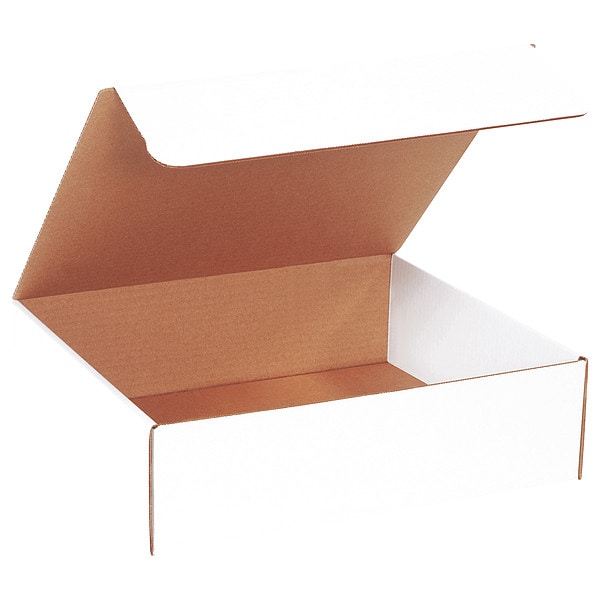 Literature Mailer, Wall Type Single Wall, Inside Length 14 in, Inside Width 12 in, Inside Height 4 in, 14x12x4 in Inside LxWxH, ECT-32-B, Outside Length 14 in, Outside Width 12 in, Outside Height 4 in, 14-3/4x12-1/2x4-1/4 in Outside LxWxH, Wall Thickness 3/16 in, Fluting Profile B Flute, Maximum Load Capacity 65 lb, Material Corrugated Cardboard, Color White, Post-Consumer Recyclability 100 Percent, Standards Not Applicable
