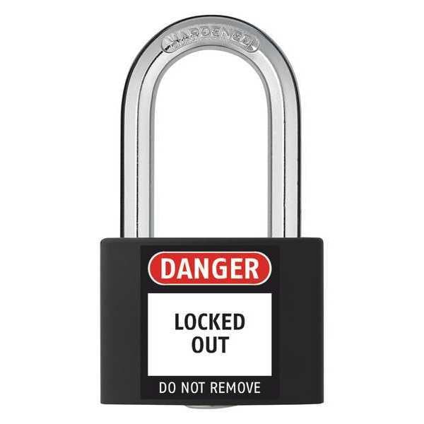 Lockout Padlock, Body Color Black, Body Height 2 in, Body Material Aluminum, Body Thickness 11/16 in, Body Width 1 5/16 in, Header None/No Header, Key Type Keyed Different, Shackle Diameter 1/4 in, Shackle Height 1 7/16 in, Shackle Material Hardened Steel, Shackle Type Open, Width Across Shackle 7/8 in, Legend Danger Locked Out