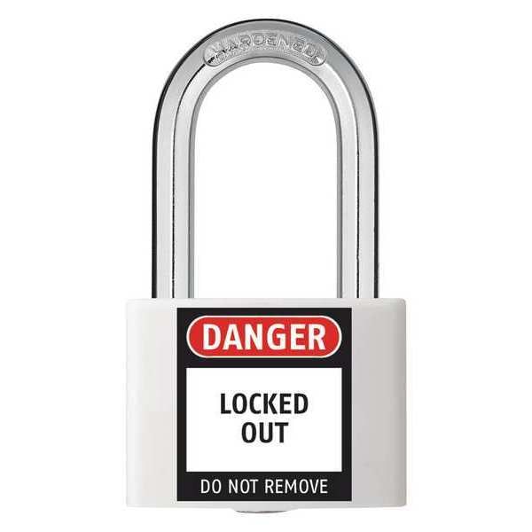 Lockout Padlock, Body Color White, Body Height 2 in, Body Material Aluminum, Body Thickness 11/16 in, Body Width 1 5/16 in, Header None/No Header, Key Type Keyed Different, Shackle Diameter 1/4 in, Shackle Height 1 7/16 in, Shackle Material Hardened Steel, Shackle Type Open, Width Across Shackle 7/8 in, Legend Danger Locked Out