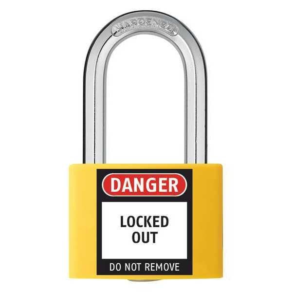 Lockout Padlock, Body Color Yellow, Body Height 2 in, Body Material Aluminum, Body Thickness 11/16 in, Body Width 1 5/16 in, Header None/No Header, Key Type Keyed Different, Shackle Diameter 1/4 in, Shackle Height 1 7/16 in, Shackle Material Hardened Steel, Shackle Type Open, Width Across Shackle 7/8 in, Legend Danger Locked Out