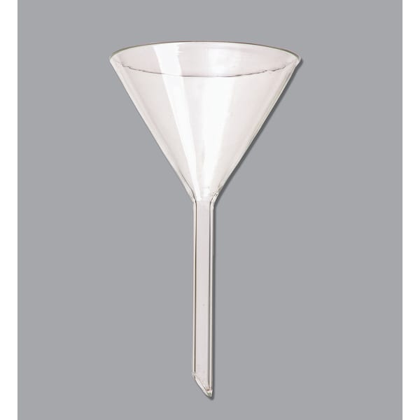Pack of six borosilicate glass funnels with long stems, beaded tops and 60° cone angles. Each funnel has a top diameter of 65mm, a stem length of 150mm and an overall length of 205mm.